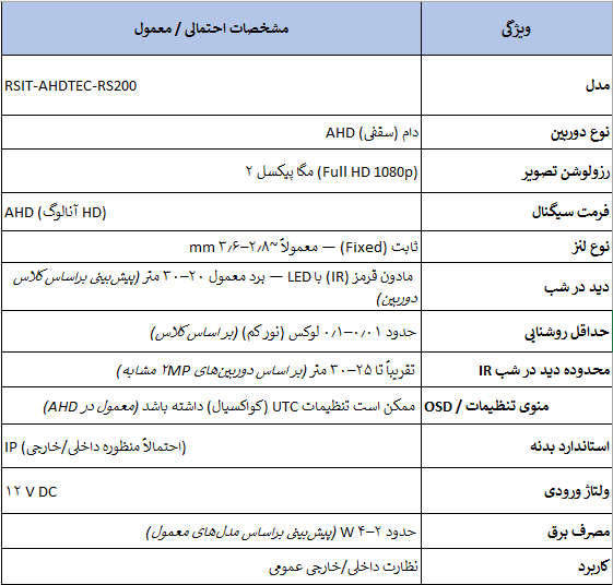دوربین مداربسته دام 2 مگاپیکسلی RSIT-AHDTEC-RS200 یک گزینه اقتصادی و کاربردی برای نظارت تصویری با کیفیت Full HD در فضاهای داخلی و نیمهداخلی است.