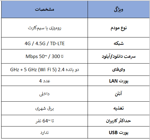 جنبه: سرعت اینترنت | ارزیابی: تا 300 Mbps – مناسب استفاده خانگی جنبه: وای‑فای | ارزیابی: دو بانده Wi‑Fi 5 جنبه: پورتها | ارزیابی: 4 LAN – عالی برای شبکه سیمی جنبه: کاربرد | ارزیابی: خانوادگی / اداری کوچک