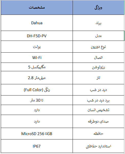 دوربین مداربسته داهوا مدل DH-F5D-PV یک دوربین بیسیم (Wi-Fi) از نوع بولت با وضوح تصویر 5 مگاپیکسل است که برای نظارت تصویری در محیطهای داخلی و خارجی طراحی شده است. این دوربین با برخورداری از تصویر رنگی در شب، قابلیت تشخیص هوشمند انسان و ارتباط صوتی دوطرفه، گزینهای مناسب برای منازل، فروشگاهها، دفاتر اداری، پارکینگها و حیاطها به شمار میرود.