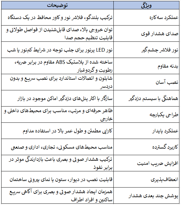در کنار بلندگو، این محصول دارای فلاشر نور با شدت بالا است که هنگام فعال شدن سیستم، چشمگیر و قابلتوجه است. نور فلاشر، در شرایط کمنور یا شب، توجه افراد حاضر و حتی سارقین را جلب میکند و باعث افزایش بازدارندگی و تأثیرگذاری سیستم امنیتی میشود. ترکیب صدا و نور در یک دستگاه، تجربه هشدار چندحسی ایجاد میکند که امنیت محیط را تا حد زیادی تقویت میکند.