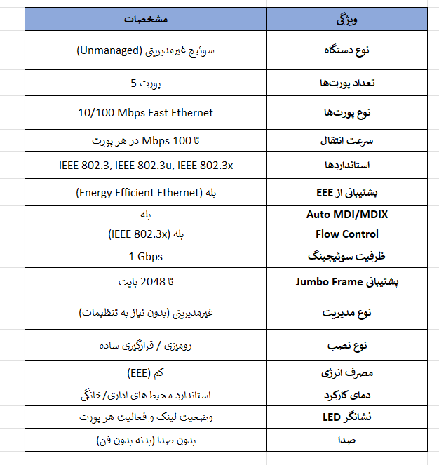 سوئیچ ۵ پورت Fast Ethernet بیصدا و Plug-and-Play برای شبکههای خانگی و دفاتر کوچک، مناسب اتصال چندین دستگاه با سرعت پایدار.