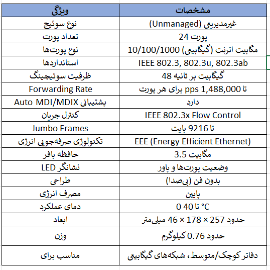 سوئیچ D‑Link DGS‑1024A یک گزینه اقتصادی و قابل اعتماد برای شبکههای کوچک تا متوسط است که نیاز به اتصال Gigabit برای تعداد زیادی دستگاه دارد. طراحی بیصدا، مصرف انرژی پایین، و سادگی در نصب از نقاط قوت عمده آن هستند و نصب آن سریع و بدون پیچیدگی است.