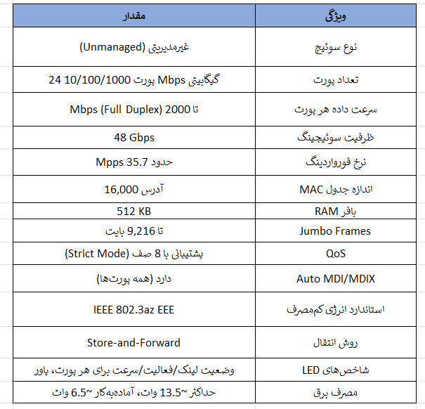 پشتیبانی از: Auto MDI/MDIX، Jumbo Frames، QoS، IEEE 802.3az انرژی کارآمد