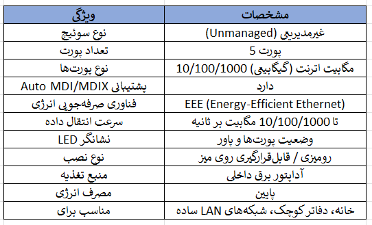 این سوئیچ دارای ۵ پورت RJ‑45 با پشتیبانی از ۱۰/۱۰۰/۱۰۰۰ مگابیت بر ثانیه است و تمام پورتها از MDI/MDI‑X خودکار پشتیبانی میکنند، بنابراین نیازی به کابلهای کراساور نیست.