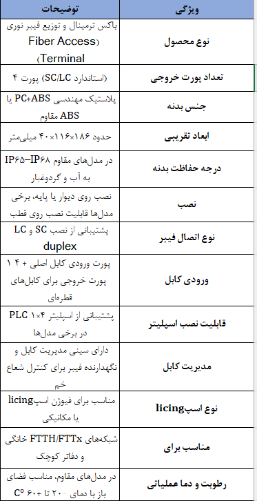 کاربرد: شبکههای FTTH خانگی، دفاتر کوچک، ساختمانهای مسکونی، نصب روی دیوار یا داخل رک