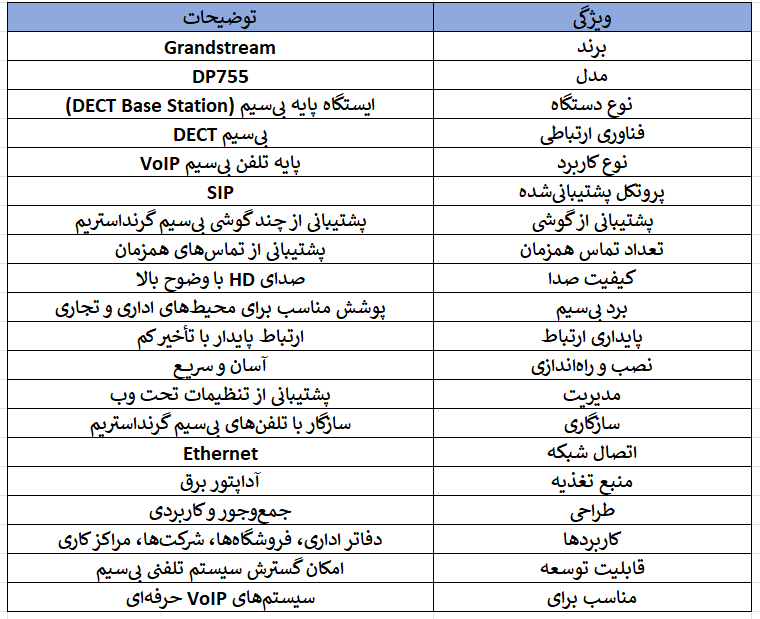 دکت (DECT) گرنداستریم مدل DP755 یک ایستگاه پایه بیسیم حرفهای است که برای تلفنهای بیسیم تحت شبکه ساخته شده و امکان ارتباط VoIP را با کیفیت بالا فراهم میکند. این دستگاه برای دفاتر، کسبوکارها، فروشگاهها و محیطهای کاری که نیاز به پوشش بیسیم دارند، طراحی شده است و بهعنوان هاب اصلی برای گوشیهای بیسیم گرنداستریم به کار میرود.
