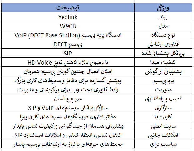 Yealink W90B یک ایستگاه پایه DECT حرفهای است که با پشتیبانی از 10 هندست و 8 تماس همزمان، کیفیت صدای HD، فناوری حذف نویز، امنیت بالای ارتباطات و قابلیت نصب آسان با PoE، گزینهای مناسب برای دفاتر متوسط و کوچک به شمار میآید.