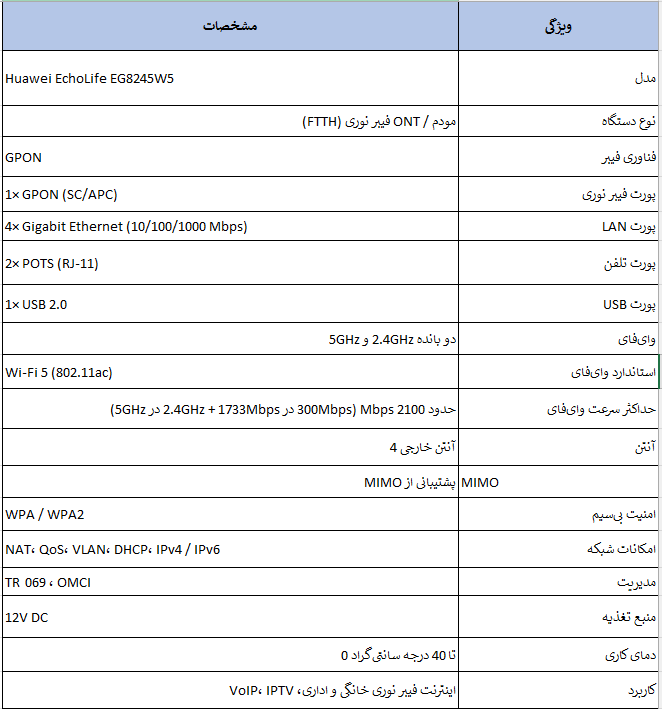 اگر برای مصارف خانگی، دفاتر کوچک یا استفاده چندکاربره به مودمی قابل اعتماد نیاز دارید، مودم هوآوی EchoLife EG8245W5 ارزش بررسی و انتخاب را دارد، بهخصوص اگر سرویس اینترنت فیبر نوری را در منطقه خود دارید.