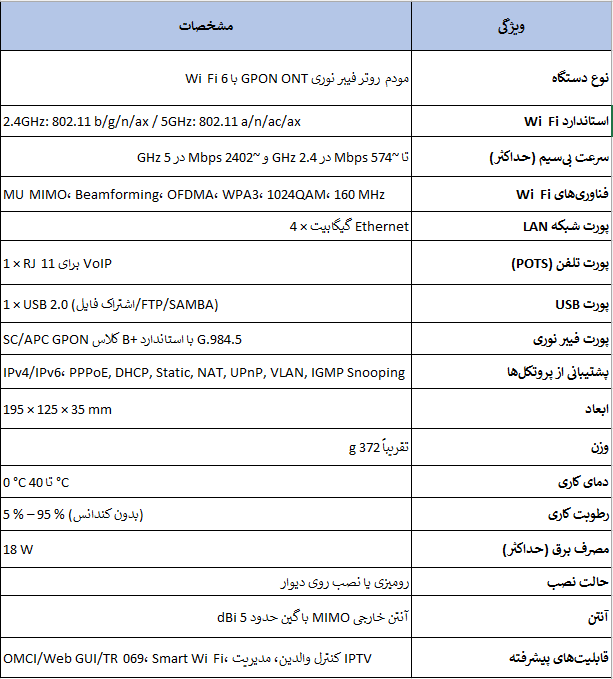 مودم از فناوری Wi‑Fi 6 (802.11ax) پشتیبانی میکند که نسبت به نسلهای قبلی پهنای باند بیشتر، سرعت بالاتر، مدیریت بهتر چند دستگاه بهطور همزمان و مصرف انرژی بهینهتر را فراهم میکند.