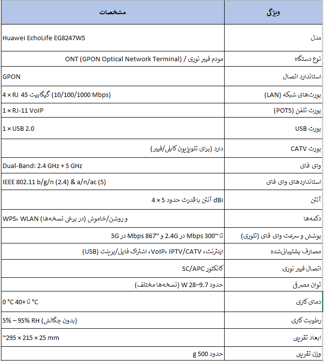 مودم فیبرنوری هوآوی EG8247W5 یک دستگاه ONT فیبر نوری بسیار کامل و قابل اعتماد برای استفاده خانگی، اداری سبک و سازمانهای کوچک است. با پشتیبانی از GPON، پوشش وای‑فای خوب، پورتهای متنوع و امکانات بسیار قابل قبول، این مودم گزینهای مطمئن برای کسانی است که به دنبال اتصال فیبر نوری با عملکرد بالا هستند. اگر سرعت و کیفیت اتصال برایتان مهم است، مودم فیبرنوری هوآوی EG8247W5 میتواند یکی از بهترین انتخابها در این رده باشد.