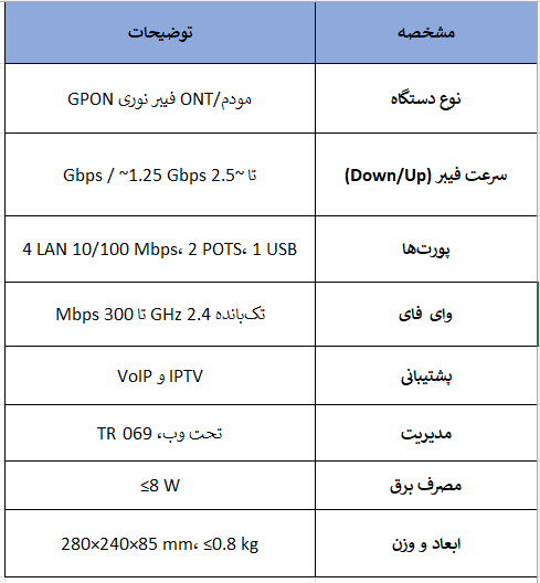 شبکه و فیبر نوری: GPON با سرعت دانلود 2.488 Gbps و آپلود 1.244 Gbps، کانکتور SC/UPC