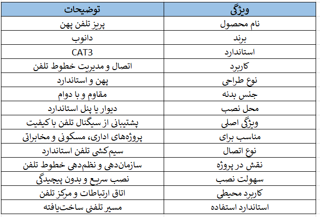 پریز تلفن پهن دانوب CAT3 پریزی ساده و اقتصادی برای نصب خطوط تلفن و فکس در محیطهای خانگی و اداری است.