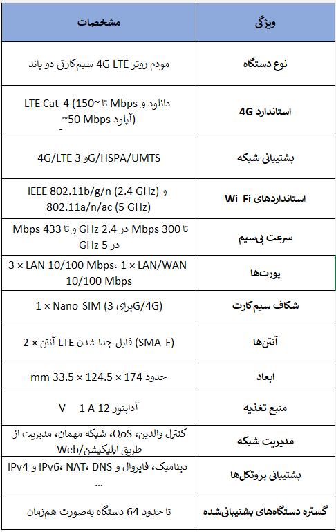 پشتیبانی از 4G LTE Cat‑4 (دانلود تا حدود 150 Mbps و آپلود حدود 50 Mbps) و حالت fallback برای 3G