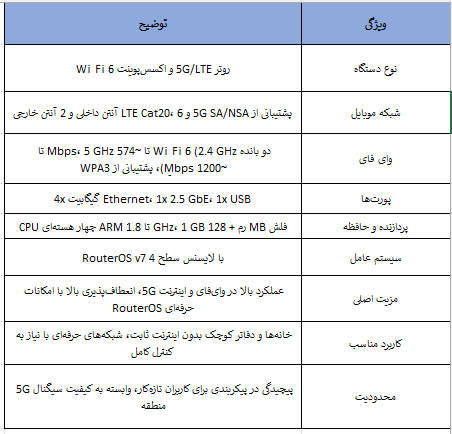 MikroTik Chateau 5G ax یک دستگاه روتر 5G/LTE پیشرفته با Wi‑Fi 6 و امکانات حرفهای RouterOS است که برای کاربران حرفهای و نیازهای پیچیده شبکه بسیار مناسب است، اما برای استفاده صرفاً خانگی ساده ممکن است بیش از حد پیچیده باشد.