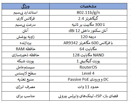 - توان آنتن: 12dBi (زاویه تابش 60 درجه)