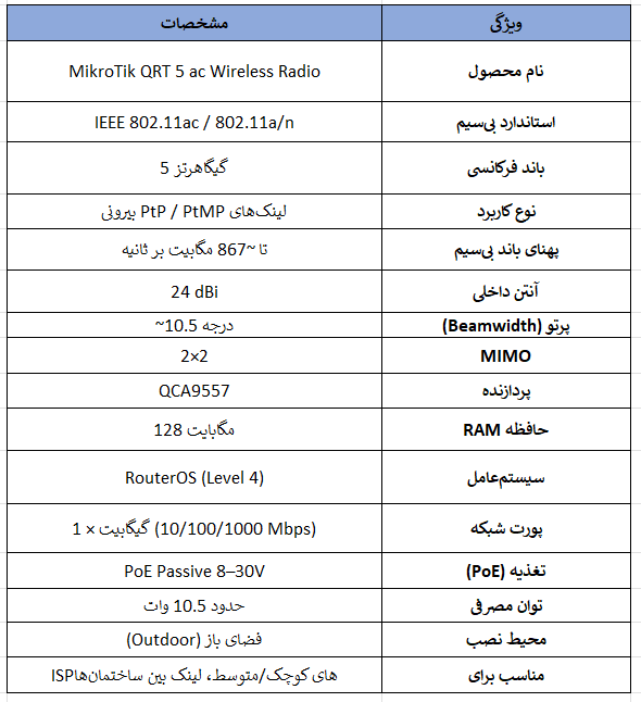 MikroTik QRT 5 ac یک دستگاه وایرلس حرفهای و مقاوم برای استفادههای بیرونی است که با آنتن متمرکز 24 dBi و استاندارد 802.11ac عملکرد بالا در لینکهای نقطهبهنقطه ارائه میدهد. این محصول با RouterOS قابل تنظیم و مناسب برای شبکههای تخصصی است، ولی برای کاربردهای عمومی و پوششهای گسترده مناسب نیست.