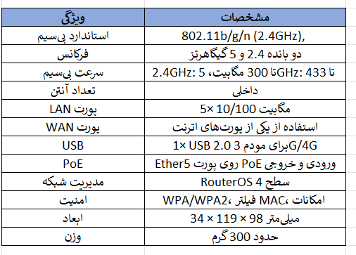 این روتر مجهز به پردازنده 650 مگاهرتزی و 64 مگابایت حافظه RAM است و میتواند شبکههای کوچک را با چندین دستگاه متصل مدیریت کند. سرعت بیسیم در باند 2.4GHz تا 300 مگابیت بر ثانیه و در باند 5GHz تا 433 مگابیت بر ثانیه است. پنج پورت اترنت 10/100 مگابیت دارد و یکی از آنها قابلیت PoE‑Out و همچنین اتصال مودم 3G/4G از طریق پورت USB را فراهم میکند.