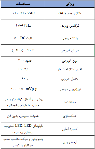 ولتاژ ورودی (AC) حدود 180–240 VAC است که اجازه میدهد پاور در شبکههای برق خانگی یا صنعتی با نوسانات کم کار کند. فرکانس ورودی بین 47–63 Hz است. ولتاژ خروجی 5 V DC ثابت بوده و حتی در تغییرات بار نسبتا زیاد، ولتاژ تقریباً پایدار میماند. جریان خروجی تا 40 A (حداکثر) است و توان خروجی حدود 200 W (5 V × 40 A) میباشد. تغییر ولتاژ تحت بار ±1–2% است که نشان میدهد ولتاژ در بارهای سبک یا سنگین کمی تغییر میکند. پاور معمولاً تا حدود 60 °C در دمای محیط کار میکند و نویز و ریپل خروجی آن حدود 100–150 mVp‑p است که برای LED و پروژههای عمومی مناسب است. حفاظتها شامل بیشبار و اتصال کوتاه بوده و در برخی مدلها با بازیابی خودکار همراه است. خنکسازی معمولاً بدون فن و از طریق همرفت طبیعی هوا انجام میشود.