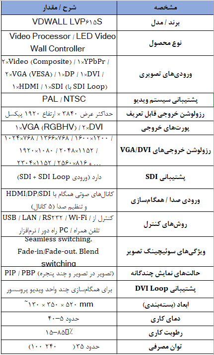 VDWALL LVP615S یک ویدیو پروسسور حرفهای است که با پشتیبانی از ورودیهای متنوع، سوئیچینگ بیوقفه، کنترل انعطافپذیر و پشتیبانی SDI، برای پروژههای میدانی، نمایشگرهای LED، سالنهای همایش و رویدادهای زنده بسیار مناسب است. اگر نیاز شما ترکیب چند منبع تصویری و کنترل کامل برای نمایشگرهای بزرگ باشد، این دستگاه ارزش سرمایهگذاری دارد.
