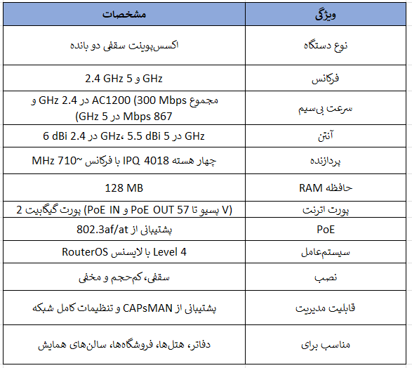 MikroTik cAP XL ac یک اکسسپوینت سقفی حرفهای دو بانده است که برای استفاده در محیطهای متوسط تا بزرگ طراحی شده و تمرکز آن روی پوشش گسترده، مدیریت شبکه و نصب مخفی است.