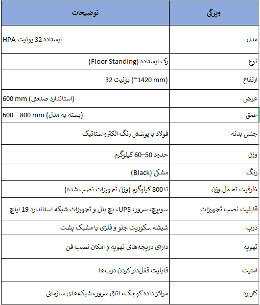 رک HPA ایستاده 32 یونیت با استاندارد 19 اینچی، عمق 100/80/60 سانتیمتر، دربهای چهار طرفه، تهویه مناسب، چرخهای قفلدار و پنلهای جانبی بازشو، گزینهای ایدهآل برای شبکههای متوسط تا بزرگ است.