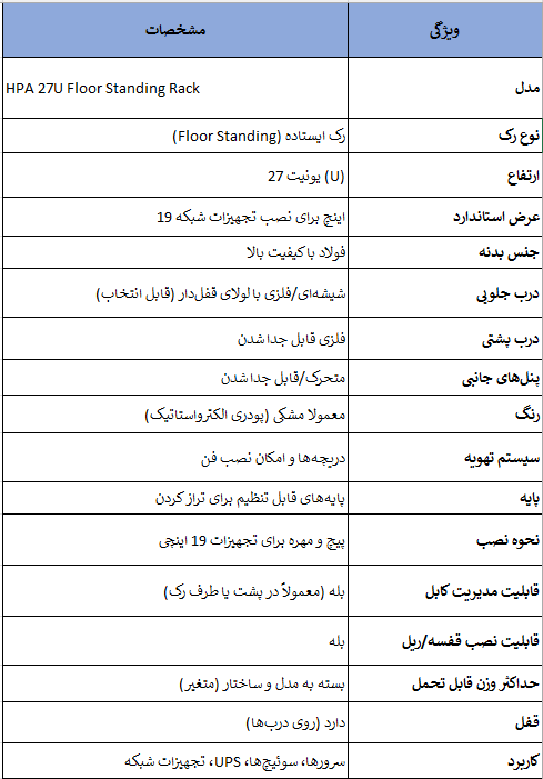 رک HPA ایستاده 27 یونیت با استاندارد 19 اینچی، عمق 100 سانتیمتر، درب شیشه سکوریت، تهویه مناسب، چرخهای قفلدار و پنلهای جانبی بازشو، گزینهای مناسب برای شبکههای متوسط است.