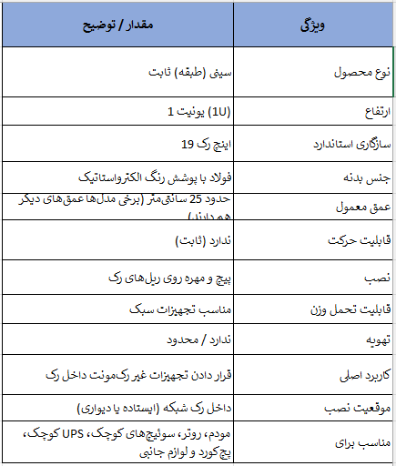 مدیریت بهتر فضای رک: استفاده از سینی ثابت امکان بهرهوری بهتر از فضای داخلی رک و چیدمان منظم تجهیزات غیر رکمونت را فراهم میکند.