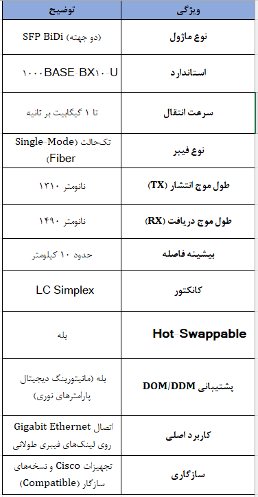 برای ایجاد لینک باید از جفت ماژول BiDi (U و D) استفاده شود. ماژول برای تجهیزات Cisco طراحی شده و بهترین عملکرد را با آنها دارد. برای رسیدن به بیشینه مسافت تا 10 کیلومتر، باید از کابل فیبر تکمد استاندارد و کانکتور LC مناسب استفاده کرد. قابلیت Hot-Swappable امکان نصب بدون خاموش کردن دستگاه را فراهم میکند. قابلیت DOM/DDM برای مانیتورینگ از راه دور لینکهای فیبر استفاده میشود و مشکلات احتمالی را قبل از قطعی فیزیکی شناسایی میکند.