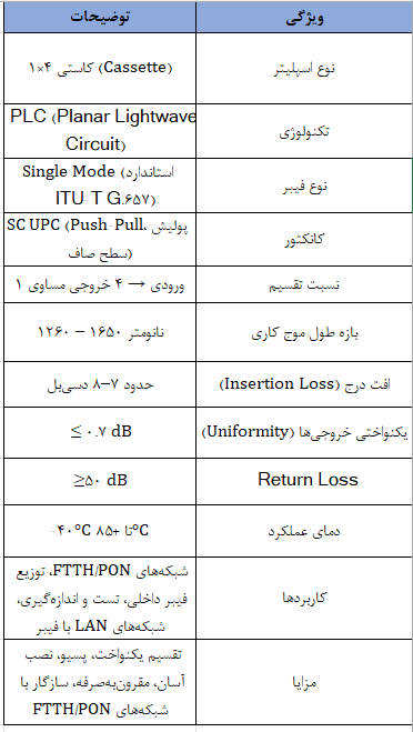 نسبت تقسیم: سیگنال نوری ورودی به چهار خروجی تقریبا مساوی تقسیم میشود. بازه طول موج کاری اسپلیترهای 1×4 معمولاً ۱۲۶۰ تا ۱۶۵۰ نانومتر است که تمام سرویسهای FTTH و شبکههای GPON و EPON را پوشش میدهد. افت درج (Insertion Loss) معمولاً بین ۷ تا ۸ دسیبل برای هر خروجی است که طبیعی است زیرا سیگنال باید بین چهار خروجی تقسیم شود. Return Loss ≥50 dB برای UPC است که نشاندهنده بازتاب بسیار کم نور به منبع است. اختلاف توان بین خروجیها معمولاً کمتر از 0.7 dB است و دمای عملکرد اسپلیتر بین -40°C تا +85°C قرار دارد. تجهیزات PLC عمر طولانی دارند و پایداری عملکرد آنها در طول زمان و تغییرات دما مناسب است.
