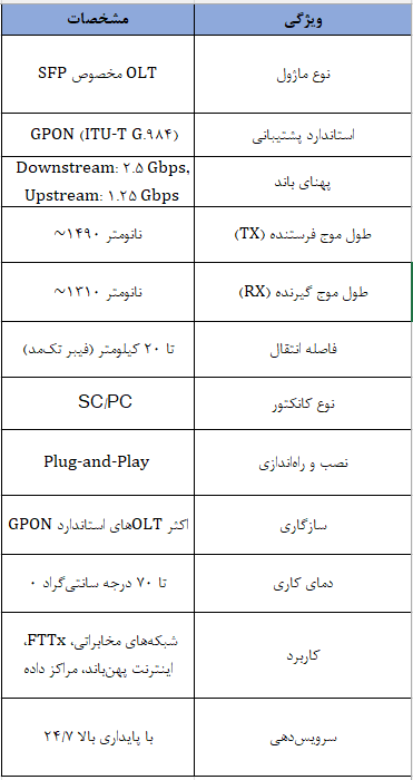 سازگاری با GPON، این ماژول مطابق استانداردهای GPON عمل میکند و با اکثر OLTهای تجاری و اپراتوری سازگار است. پهنای باند استاندارد با سرعت انتقال ۲.۵ Gbps downstream و ۱.۲۵ Gbps upstream، مناسب برای خدمات اینترنت پرسرعت کاربران نهایی است. انتقال داده تا فاصله متوسط تا ۲۰ کیلومتر، نصب آسان و Plug‑and‑Play بدون نیاز به پیکربندی پیچیده، و پایداری و دوام برای سرویسدهی مستمر از دیگر ویژگیهای مهم آن است.