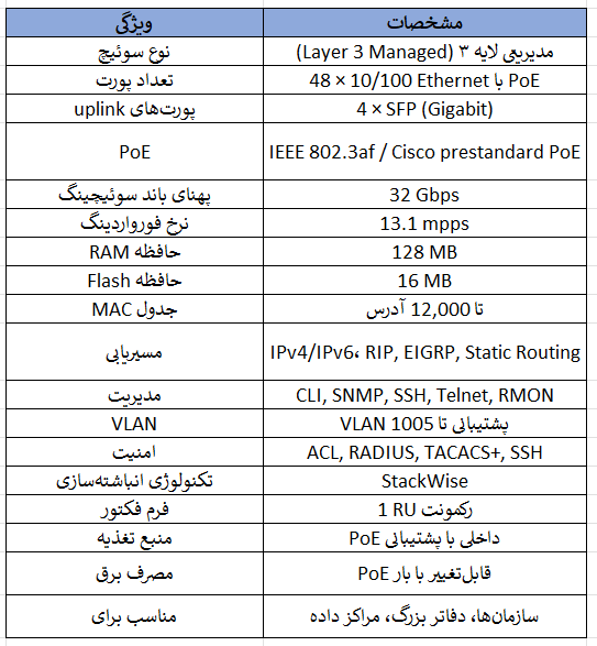 سوئیچ Cisco Catalyst 3750‑48PS‑E یک سوئیچ مدیریتی لایه 3 از سری 3750 شرکت سیسکو است که برای شبکههای سازمانی متوسط تا بزرگ طراحی شده است. این مدل برای محیطهایی مناسب است که ترکیبی از پورتهای متعدد، قابلیت PoE و توانایی مسیریابی پایه تا متوسط مورد نیاز باشد. این سوئیچ دارای 48 پورت Fast Ethernet 10/100 با پشتیبانی از PoE و 4 پورت SFP گیگابیت برای uplink است و از مجموعه ویژگیهای IP Services بهره میبرد که امکانات مسیریابی پیشرفته و پشتیبانی از IPv6 را فراهم میکند.