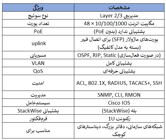 مدیریت کامل سوئیچ از طریق CLI، SNMP، Telnet، SSH و ابزارهای مدیریتی Cisco IOS