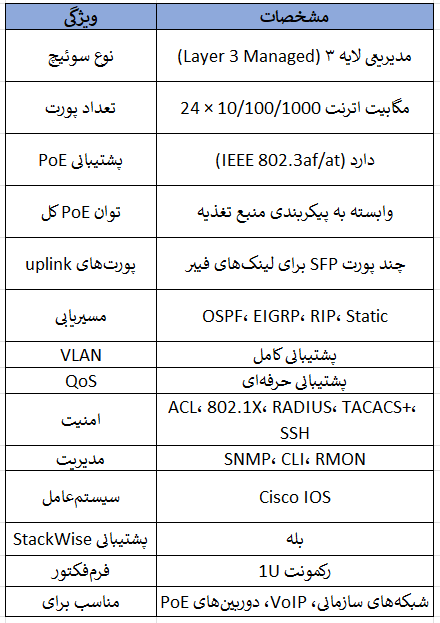 Cisco Catalyst WS‑C3750G‑24PS‑E یکی از مدلهای سوئیچ لایه ۳ مدیریتپذیر در سری Catalyst 3750G است که برای استفاده در شبکههای سازمانی متوسط تا بزرگ، دفاتر شعب و مراکز داده کوچک طراحی شده است. این سوئیچ بهویژه برای شبکههایی که نیاز به PoE (تغذیه برق از طریق اترنت) و امکانات پیشرفته مدیریتی دارند مناسب است