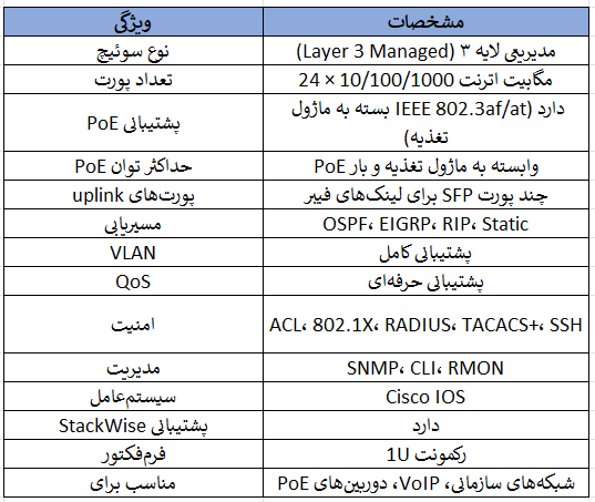 قابلیتها: مدیریت CLI، SNMP، VLAN، QoS، ACL، روتینگ پایه، IPv6 و غیره