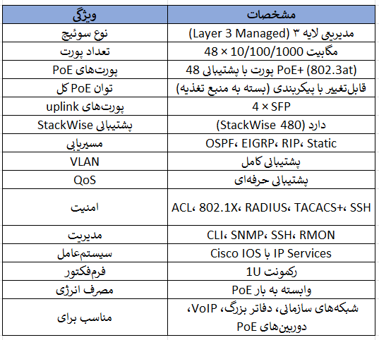 Cisco WS-C3750X-48PF-L یک سوئیچ مدیریتی ۴۸ پورت گیگابیت با PoE/PoE+ و Layer 3 Lite مناسب شبکههای متوسط تا بزرگ سازمانی است.