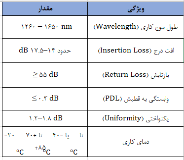 افت درج بیانگر کاهش توان نوری هنگام عبور سیگنال از اسپلیتر است. بازتابش ≥55 dB نشان میدهد بخش کمی از سیگنال به منبع باز میگردد و کیفیت سیگنال حفظ میشود. یکنواختی پایین نشاندهنده تقسیم تقریباً مساوی توان بین تمام خروجیها است.