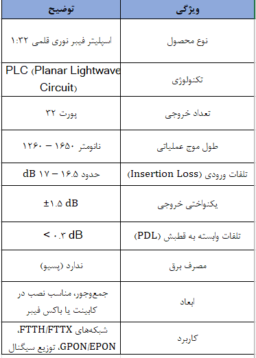در این اسپلیترها، سیگنال نوری ورودی از یک پورت وارد شده و به 32 خروجی تقسیم میشود. تلفات نوری (Insertion Loss) معمولاً برای نسبت تقسیم 1:32 حدود 16.5 تا 17 دسیبل است که مقدار طبیعی برای تقسیمهای بزرگ است. همچنین، پارامترهایی مثل یکنواختی قدرت خروجیها (Uniformity) و تلفات وابسته به قطبش (PDL) کیفیت عملکرد نهایی اسپلیتر را تعیین میکنند.