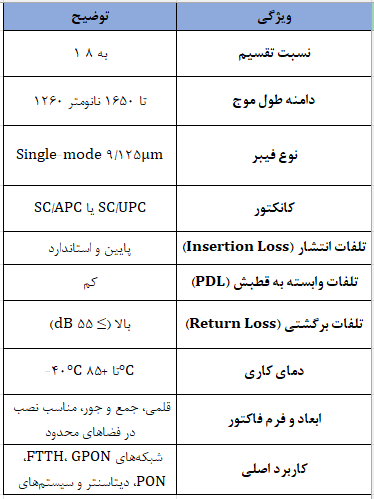 این اسپلیتر از فناوری PLC یا Planar Lightwave Circuit استفاده میکند. PLC امکان تقسیم یکنواخت سیگنال نوری با افت پایین و کیفیت بالا را فراهم میکند. تلفات ناشی از قطبش نور (PDL) کم و تلفات برگشتی (Return Loss) بالا هستند، که باعث پایداری سیگنال در خروجیها میشود. طراحی قلمی یا Mini-Module نصب و مدیریت آن را در فضاهای محدود مانند جعبههای Splice یا پچ پنل بسیار آسان میکند.