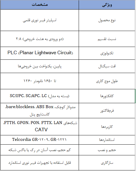 پشتیبانی از شبکههای متنوع و پهنای باند گسترده: اسپلیتر 2:8 قابلیت کار در بازه طول موج 1260 تا 1650 نانومتر را دارد و برای شبکههای FTTH، GPON، CATV و سایر شبکههای فیبر نوری مناسب است.