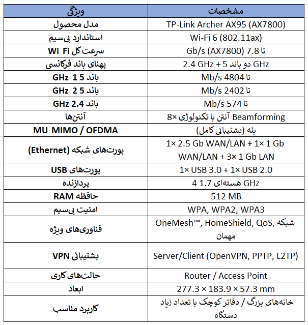 Archer AX95 یک روتر قدرتمند و مدرن برای کاربران خانگی با نیازهای اینترنتی سنگین است که سرعت بالا، پوشش گسترده و امکانات امنیتی کامل را در یک دستگاه ارائه میدهد. این روتر انتخاب مناسبی برای خانههای بزرگ و شبکههای چنددستگاهی محسوب میشود.