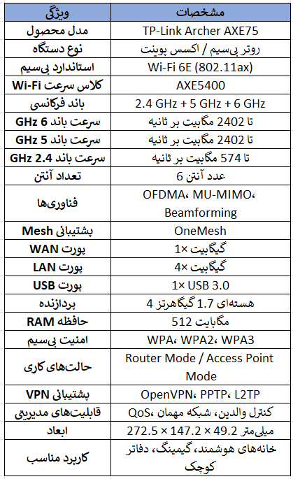 Archer AXE75 یک روتر سهبانده با پشتیبانی از Wi-Fi 6E، سرعت ترکیبی ۵۳۷۸Mbps و مدیریت آسان از طریق اپلیکیشن Tether است که برای خانهها و دفاتر کوچک مناسب میباشد.