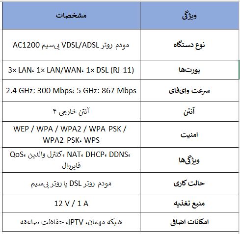 مودم از وایفای دوبانده AC1200 پشتیبانی میکند که امکان اتصال چندین دستگاه همزمان با سرعت مناسب را فراهم میکند. پروتکلهای امنیتی WPA/WPA2 و قابلیت WPS امنیت شبکه بیسیم را تضمین میکنند.
