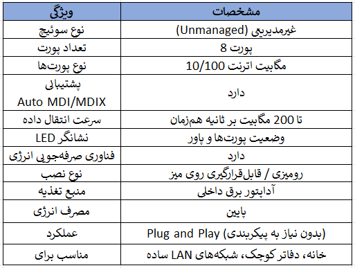 این دستگاه از فناوری Plug and Play پشتیبانی میکند، به این معنی که برای راهاندازی فقط کافی است کابلها را وصل کنید و دستگاه روشن شود؛ هیچ تنظیمات پیچیده نرمافزاری یا مدیریتی لازم نیست. بدنه سوئیچ از پلاستیک مقاوم ساخته شده و طراحی جمعوجور آن امکان قرار دادن روی میز یا نصب در قفسههای کوچک را فراهم میکند. مزیت دیگر این سوئیچ، فناوری صرفهجویی در انرژی است که مصرف برق را کاهش میدهد و باعث میشود دستگاه حتی در استفاده طولانی مدت، بازدهی انرژی مناسبی داشته باشد. همچنین سوئیچ از پروتکلهای استاندارد کنترل جریان داده مانند IEEE 802.3x و backpressure پشتیبانی میکند، که باعث میشود ترافیک شبکه روانتر و بدون تداخل منتقل شود.