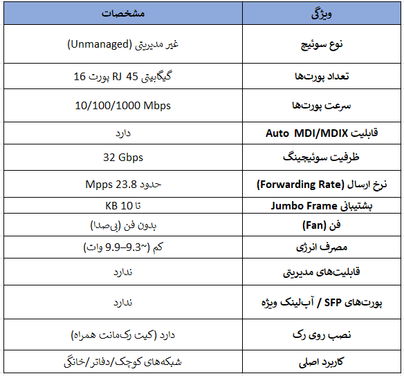 تعداد پورتها: 16 پورت RJ‑45 گیگابیت (10/100/1000Mbps)