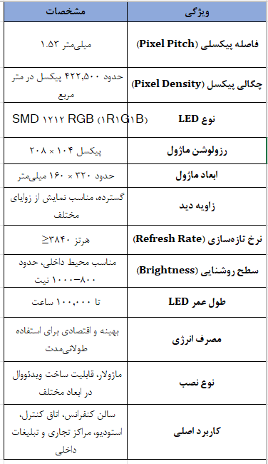 ماژول LED P1.53 داخلی یکی از گزینههای حرفهای برای ساخت نمایشگرهای LED با وضوح بسیار بالا در فضاهای داخلی است. فاصله پیکسلی 1.53 میلیمتر باعث میشود تصاویر از فاصله نزدیک کاملاً شفاف، یکدست و بدون دیده شدن ساختار پیکسل نمایش داده شوند. این ویژگی، این ماژول را برای سالنهای کنفرانس، اتاقهای کنترل، استودیوها و فضاهای تبلیغاتی داخلی بسیار مناسب کرده است.