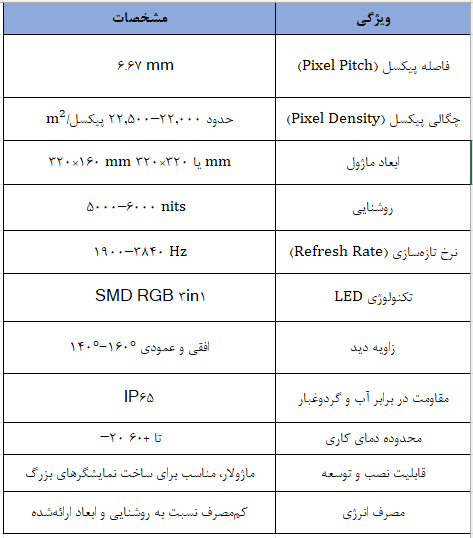 ماژولهای LED با فاصله پیکسل 6.67 میلیمتر (P6.67) برای استفاده در فضای باز طراحی شدهاند. این مقدار پیکسل پیتچ تعادلی ایدهآل بین وضوح تصویر و هزینه/ابعاد پنل ایجاد میکند، بهخصوص برای فاصله دید متوسط تا دور (حدود 6–70 متر) در محیطهای بیرونی.