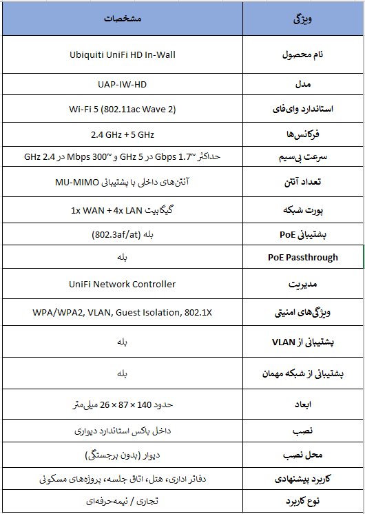 Ubiquiti UniFi HD In-Wall یک اکسس پوینت حرفهای با طراحی خاص است که علاوه بر ارائه وایفای پایدار و پرسرعت، امکانات یک سوئیچ شبکه را نیز در اختیار کاربر قرار میدهد. اگر ظاهر تمیز، مدیریت متمرکز و عملکرد قابل اعتماد برای شما اهمیت دارد، این مدل یکی از انتخابهای مناسب در رده اکسس پوینتهای Wi-Fi 5 محسوب میشود