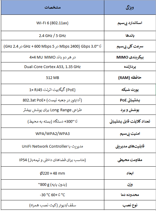 اکسسپوینت حرفهای سری UniFi شرکت Ubiquiti است که با تمرکز بر پوشش بلندبرد، سرعت بالا و پشتیبانی از استاندارد Wi‑Fi 6 طراحی شده است، مناسب برای دفاتر بزرگ، محیطهای پرجمعیت و فضاهای نیمهباز.