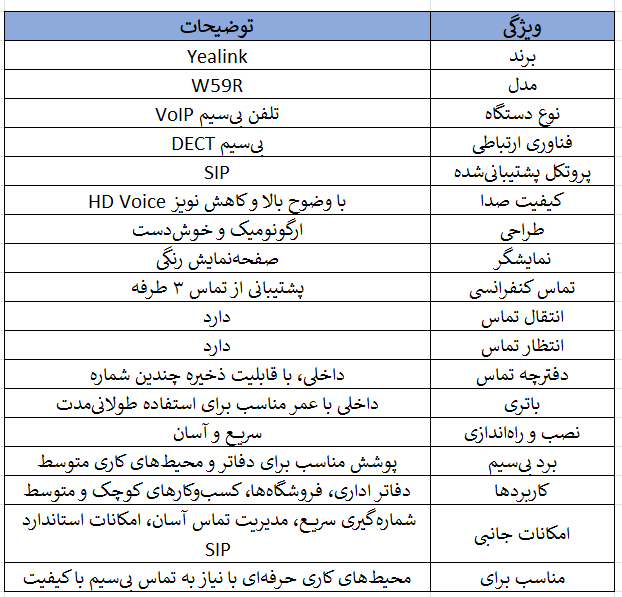 تلفن بیسیم Yealink W59R با ترکیب کیفیت صدا، ارتباط بیسیم مطمئن، طراحی کاربردی و امکانات مدیریت تماس یک انتخاب مناسب و مقرونبهصرفه برای دفاتر، فروشگاهها و کسبوکارهای کوچک تا متوسط است. این دستگاه تجربهای بیسیم، راحت و حرفهای در تماسهای VoIP فراهم میکند و به بهبود کیفیت ارتباطات تلفنی کمک میکند.